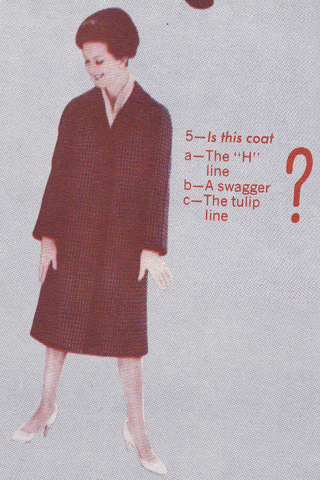 It is quite fun to look at 60s fashion and the answer is “b” in case you were wondering.