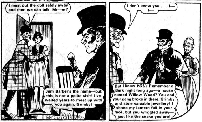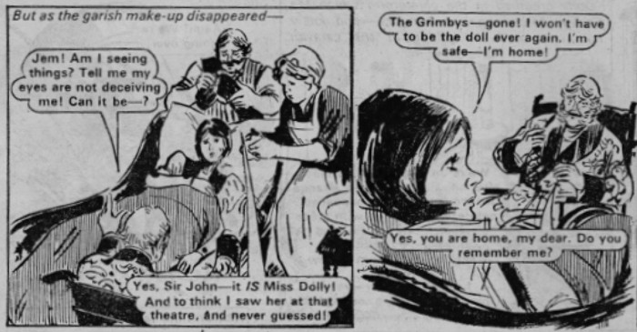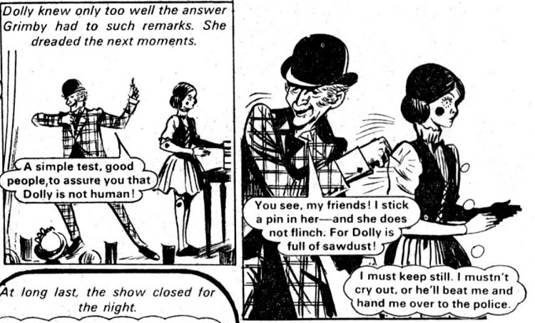 As with other stories, we see variants pop up, such as The Secret of Penny Farthing where a girl is blackmailed into pretending to be a ventriloquist dummy or Ballerina on a String where a girl performs as a dancing puppet. Due to being one of the first or perhaps because of its many reprints, this story is one that sticks in the mind more. There is also added mystery in this story, as Dolly has amnesia and we don’t know who she is or what she supposedly did. Throughout the story and Dolly’s acts of kindness, despite her own circumstances, the reader must find it hard to believe that she could have committed such a terrible crime. Meanwhile the Grimbys are deceitful, cruel guardians, forcing her to perform and slave for them, beating on her when she doesn’t meet their standards. When the truth comes out, that not only are they blackmailing her with the crime they committed, but also that they kidnapped her from a loving home, they certainly rank top among the despicable villains to appear in these comics.