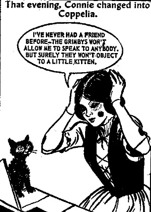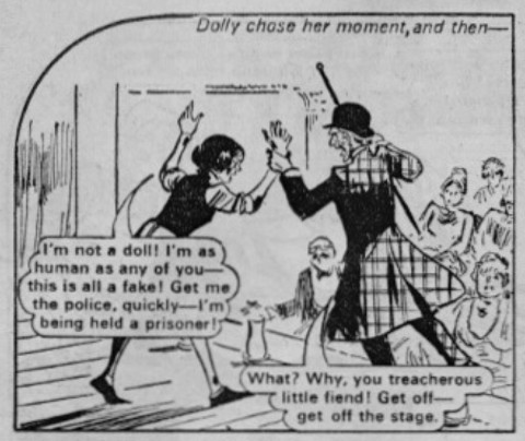 Despite her hard life and supposed criminal past, Dolly still shows kindness to others like pretending to freeze up on stage to point out a thief, being kind to an ill girl or rescuing a kitten, even though it risks punishment later . She is forced by the Grimbys to give a way the kitten to an audience member. The recipient comes back to thank the doll and seeing servant girl, Dolly, the family seem to think she looks familiar, whether they are recognising her as doll or from some place else is unclear, beginning the mystery of who really is Dolly Brown.