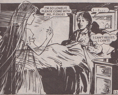 Objects exerting evil influences over people and making them act bad/out of character are completely absent from this category (except for a hint in “The Devil’s Pipe”). This is a very curious omission on Misty’s part, considering how the theme appeared so frequently in girls’ comics. In fact, this is what girls comics used evil objects most frequently for. But only once did Misty use the theme of an evil object exerting an evil influence, and that was in her serial “Journey into Fear…”